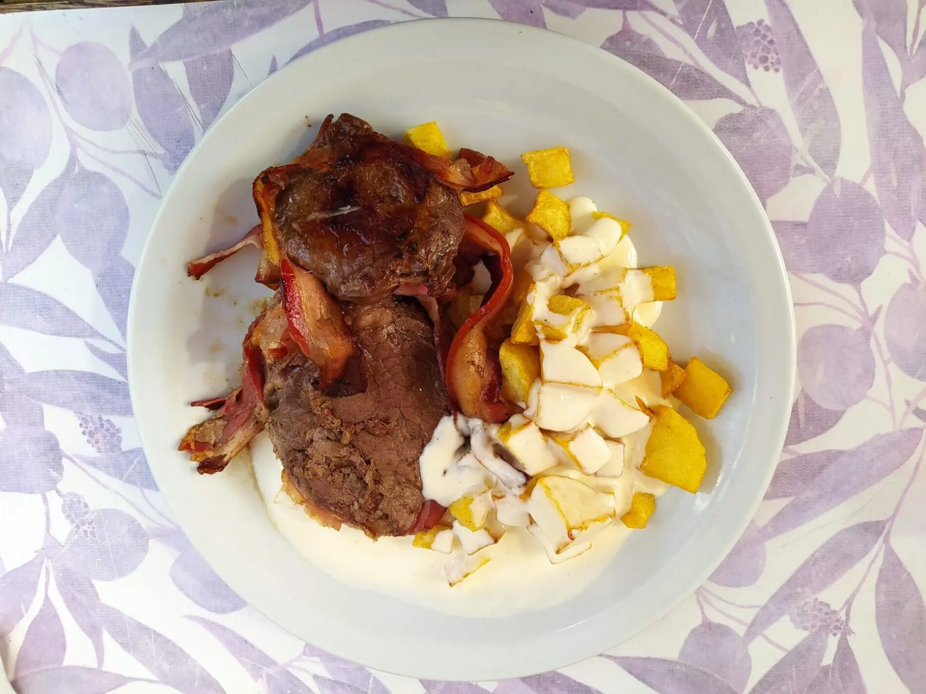 A refeição do meio, é um bife envolto de uma larga tira de bacon, batatas assadas e douradas com molho branco, um clássico simétrico e incrementado.